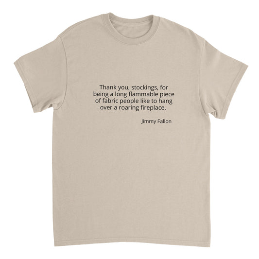 Heavyweight Unisex Crewneck T-shirt - Jimmy Fallon - Thank you, stockings, for being a long flammable piece of fabric people like to hang over a roaring fireplace.